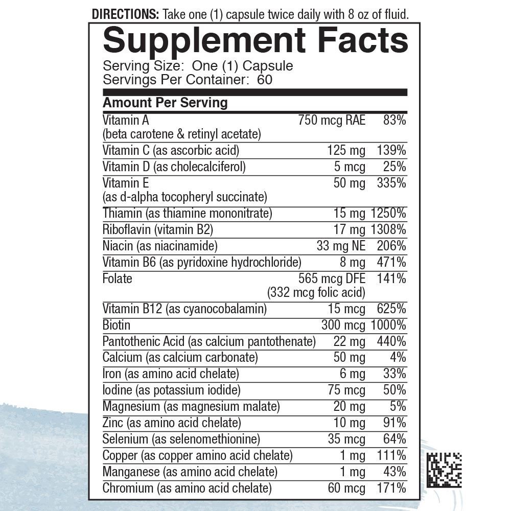 Complejo de vitaminas y minerales que contiene una cantidad óptima de vitaminas C, E, B6, B12, magnesio, selenio, ácido fólico y cromo para respaldar el bienestar general*