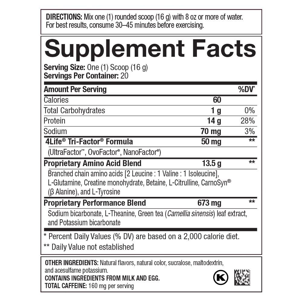 Mezcla una porción (16 g) de una generosa cucharada medidora en al menos 8 onzas de agua. Para obtener mejores resultados, tómalo entre 30 y 45 minutos antes de hacer ejercicio. Tomar un máximo de dos porciones al día. -