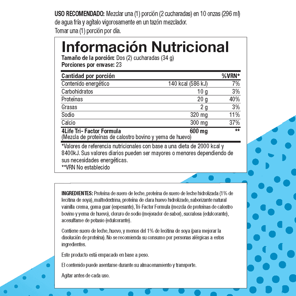 Experimenta una revolución en la transformación corporal con PRO-TF , una proteína ultraabsorbible que impulsa el desarrollo de músculo magro y potencia la quema de grasa, aumentando tus resultados hasta en un asombroso 564%. Cada porción de dos cucharadas de PRO-TF ofrece 20 gramos de proteína avanzada para transformar tu cuerpo, mejorar tu rendimiento y fortalecer tu salud en general. Además, contiene 600 miligramos de la exclusiva fórmula de refuerzo del sistema inmunitario de 4Life Transfer Factor®. PRO-TF es libre de gluten y lactosa, con tan solo 70 calorías por porción y un perfil de aminoácidos excepcional que favorece el rendimiento deportivo y la recuperación. No te pierdas la oportunidad de unirte a la revolución de la salud y el bienestar con PRO-TF™ y abraza una vida llena de vitalidad y juventud