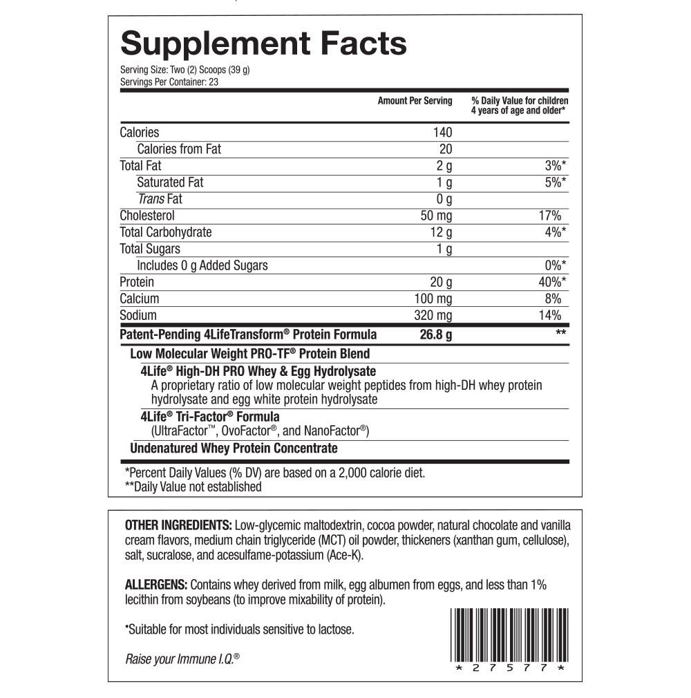 • Hidrolizado de suero de leche y huevo, 4Life Hi-DH PRO—una proporción exclusiva de péptidos de bajo peso molecular provenientes de la proteína de suero de leche y de la proteína de clara de huevo extensamente hidrolizada.*