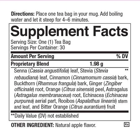 Senna (Cassia senna) leaf, cinnamon bark, buckthorn bark, bitter orange fruit, and rooibos leaf