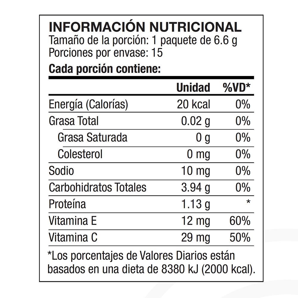 Es un suplemento alimenticio a base de colágeno hidrolizado, con vitaminas C y E que se absorben rápidamente. La vitamina C contribuye a la formación normal de colágeno para la función normal de la piel, los huesos y los cartílagos. La vitamina E contribuye a la protección de las células frente al estrés oxidativo.