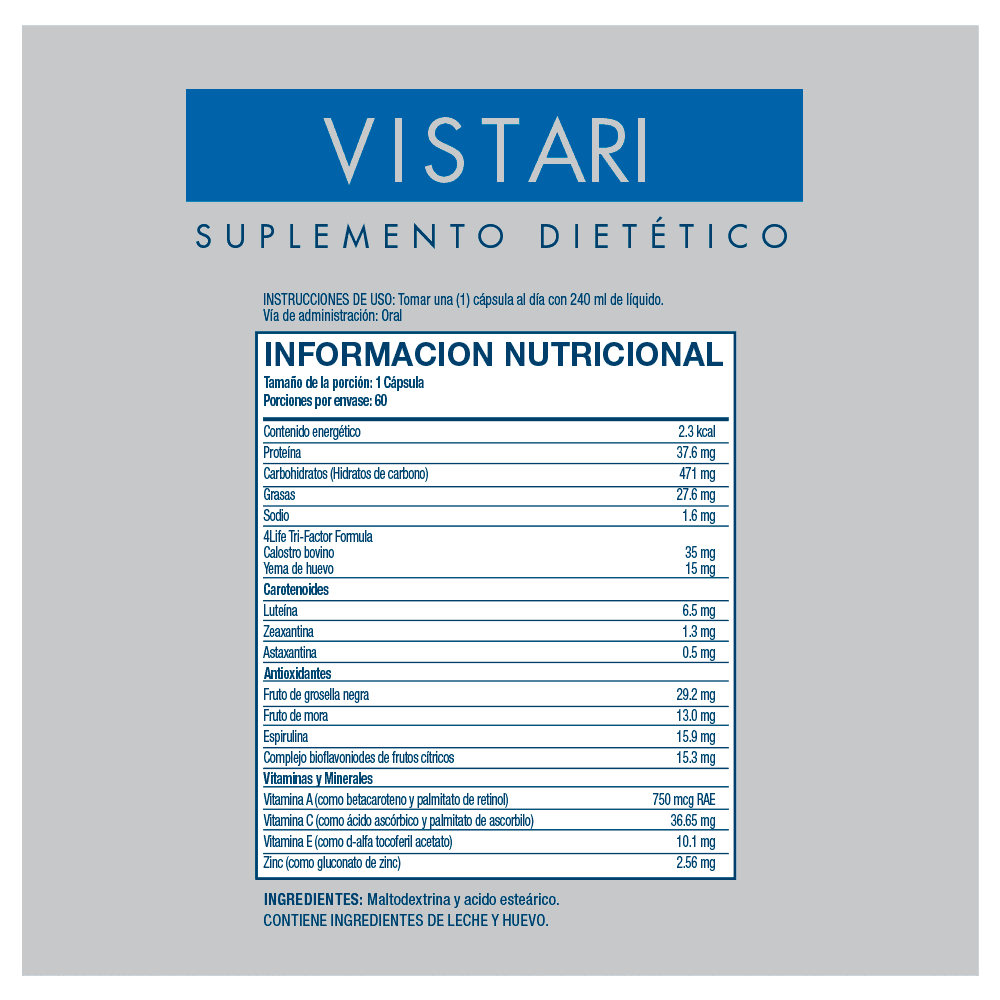 Experimenta una visión nítida y saludable con 4Life Transfer Factor Vistari, un avanzado suplemento que combina poderosos ingredientes como luteína, zeaxantina, vitaminas A y E, zinc y bioflavonoides cítricos. Este producto no solo protege la mácula ocular para una agudeza visual óptima, sino que también educa tus células inmunitarias gracias a la presencia de 4Life Transfer Factor certificado. ¡Cuida tus ojos con la marca de luteína más recomendada por médicos y mantén tu visión en su mejor forma!