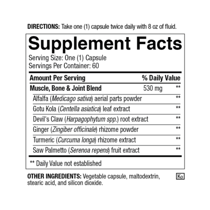 MusculoSkeletal Formula ofrece respaldo nutricional para la salud del tejido conectivo, los huesos, las articulaciones y los músculos. Esta fórmula contiene extractos de plantas como la de garra del diablo, cúrcuma y gotu kola, que han demostrado respaldar los huesos, las articulaciones y los músculos saludables. Este producto también respalda los músculos, las articulaciones y los huesos en proceso de envejecimiento al impulsar el sistema inmunitario, reducir el desgaste de los huesos, disminuir el estrés oxidativo, mejorar la circulación sanguínea y al aumentar la capacidad antioxidante